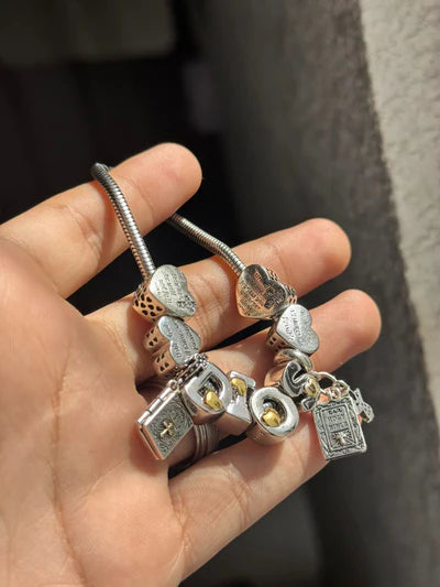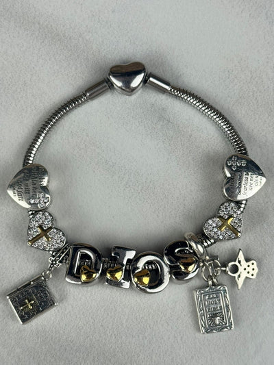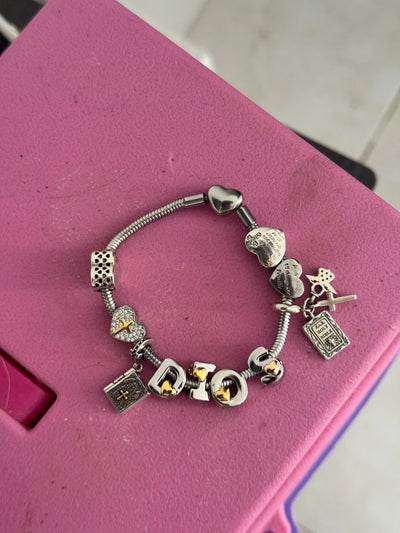 Cada pulsera incluye diez charms cristianos esenciales: 4 corazones con versículos, 4 letras que forman la palabra DIOS, dos charms colgantes de la biblia. Representando la fe, el amor y la esperanza.